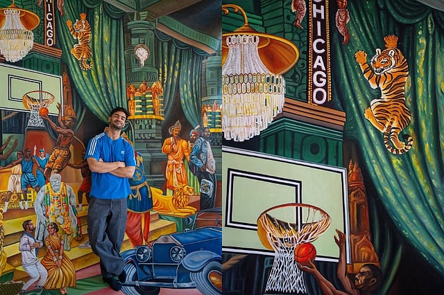 I’m not alone in my adoration for Chicago. Delhi-based artist Abhay Sehgal’s painting, ‘Chicago Durbar,’ is a tribute to the city through a distinctly homegrown lens. At a whopping 11 feet tall, the painting is a grand blend of contemporary Chicago and Indian history and heritage. Every inch of Sehgal’s canvas captures a distinct element of the two cultures, allowing them to integrate in the most fun, borderline absurd of ways. Chicago’s local basketball players meet Indian Maharajas, exchanging designer sneakers, the true jewels of the midwestern city; men in lungis scale the iconic Chicago Theatre sign like it’s a mallakhamb pole.