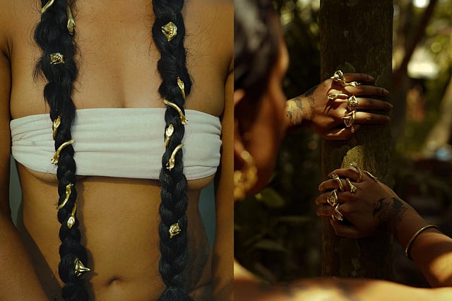 Their Devas collection, arguably Ayesha’s most renowned works, was a surrealist series of metal jewellery inspired by Hindu deities. Using digital technology to shape the designs, the Devas collection bridged ancient times with modernity, offering us access to a world that often feels inaccessible. The collection transforms ancient spiritual practices into wearable works of art — the Mudra Ear Cuff, for instance, lines one’s ear with a 3-dimensional rendering of mudra hand signals. The Sun Salutation Hoops are another stand-out piece, turning the body’s movement into a series of static mini-sculptures that flow into one another.