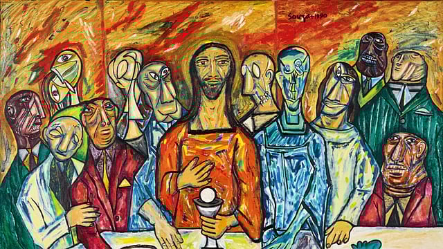 A few decades later, in the late 1980s and early 1990s, Souza painted several versions of the Last Supper in his signature style that combined Eastern and Western styles and motifs. In 'The Last Supper' (seen above), the faces of Jesus’s Apostles, with their high-set eyes, lopsided features and harsh outlines, evoke the artist’s stylised heads from the late 1950s and 60s. However, Christ himself does not suffer the same facial distortion, except for his elongated neck and enlarged features. Souza furnishes Christ with a dignity not as clear in his subversive depictions of the Apostles.