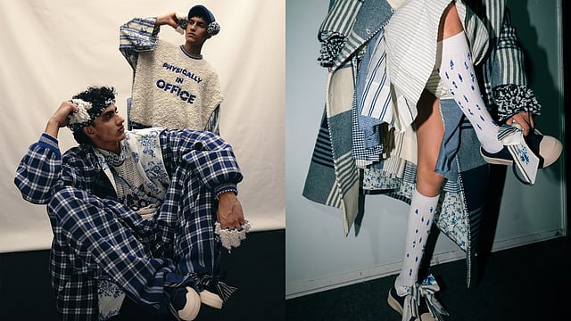 Visually, the garments remained rooted in péro’s signature language. Handcrafted textiles sourced from clusters like Maheshwari, Chanderi, Varanasi, and Kashmir came together in loose, anti-fit silhouettes - jackets, shirts, dresses, layered separates - rendered largely in a restrained blue-and-white palette. But within that restraint lay complexity: tie-dye, checks, stripes, intricate handwork that revealed itself slowly, rewarding attention.