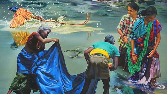 In Threads of Sustenance, Thrissur-based self-taught artist K.G. Babu depicts the fishing practices of the Adivasi community in Attappadi, located in the Western Ghats of Kerala, India. Here, fishing serves as a means of sustenance — and by extension survival — rather than trade, sourced from the surrounding natural environment with conscious choices for long-term preservation and a commitment to avoiding over-exploitation. This approach reflects the community's keen understanding of natural resources and their commitment towards maintaining ecological balance — a stark contrast to the excess-driven pursuits of endless consumption championed by contemporary capitalist cultures.