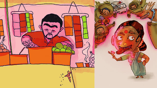 Her process is equally layered. “It starts with a memory, an incident, or a qissa,” she says, which she then dramatizes and ties to an aam cheez. The result is visual metaphors that leave room for you to connect the dots, whether it’s a sari-clad figure with Kali-like energy or a snail couple questioning traditional dynamics.