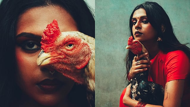 For Navin, the body is not a passive canvas for symbolic meaning but a site where ritual and rebellion can collide. “Through this series, I wanted to unravel the tension between vulnerability and power, showing how the body itself becomes both a site of tradition and a force of resistance,” he explains. The photographs embody this vision. A figure in a red dress, adorned with temple jewelry and bangles, holds a rooster close to her face and chest. At times the bird seems an extension of her body, at others it confronts the viewer directly. The gaze of human and animal interlock, shifting between intimacy and defiance.