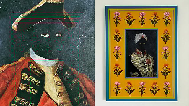 The second painting continues this exploration, further delving into the themes of identity and cultural distortion resulting from colonial influences. It portrays James Skinner, a British East India officer of Scottish-Indian heritage, who straddled a paradox of loyalty to both colonial authority and Indian culture. Like Clive, his actions also contributed to distorting the visual narrative that shaped both external perceptions of India and the artist personally commented in his artist's note about how these images made generations of Indians like him internalise and inhabit Western projections of 'Indian-ness'.