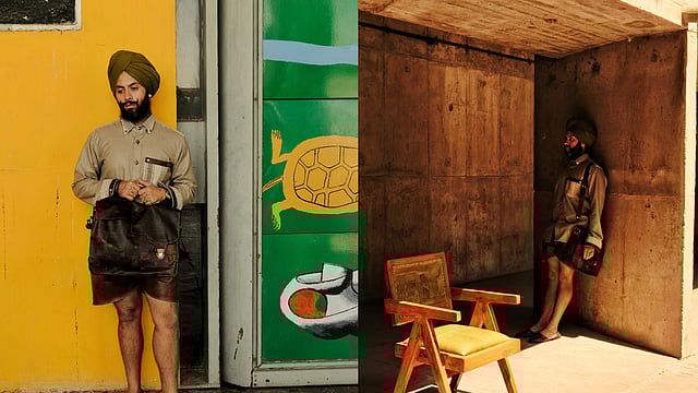 Photographed across the city with muse Gurdev, the series thrives on the art of observation. Solanki’s lens lingers on surfaces capturing how they absorb and reflect the city’s rhythms. There is an intentional restraint in the framing, a refusal to overstate, allowing Chandigarh’s geometry to assert itself without intervention. Gurdev, positioned as a working man within this landscape, moves through spaces that feel both imposing and familiar, embodying the lived tension between the city’s planned modernism and its evolving, human textures.