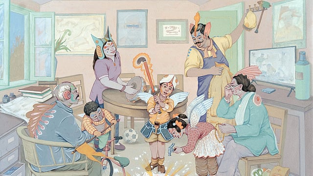 Rooted in the spirit of this centuries-old tradition of using mystic-absurdist motifs and idioms to question the status quo, Baroda-based contemporary artist Yogesh Ramkrishna's debut solo exhibition 'Ulatbansi' at Latitude 28, New Delhi, presents a compelling critique of our contemporary realities. Ramkrishna’s works — interweaving mythological, historical, and modern motifs and metaphors — blend satire, drama, and dark humor to explore the paradoxical nature of social constructs and the impact of simulated realities on individual and collective identities.