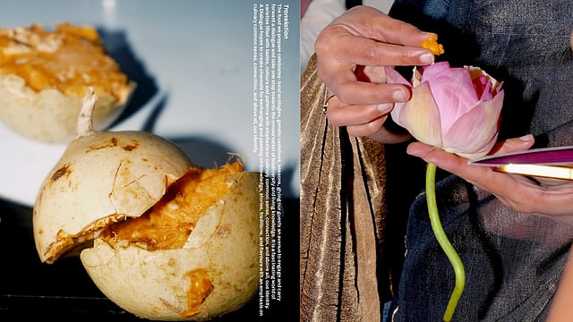All of this research is brought into public-facing formats through curated experiences — dinners, installations, and gatherings — where ingredients, techniques, and stories from specific regions are presented together. Projects like Dhanau, developed for the India Art Fair 2025, draw from the ecology of western Rajasthan, working with seasonal ingredients, material forms, and local techniques to reflect the interdependencies within that landscape. The experience unfolds as a journey, with each element from ingredients, and preparation methods, to presentation linked back to ecological relationships. In North 24 Parganas, Sundarbans — Translation 05, their research from West Bengal was developed into a culinary experience at the opening of Raw Mango. Their fieldwork here included visits to temples, local vegetable and flower markets, the central herbarium in Kolkata, and villages across the Sundarbans region, building an understanding of how ecological knowledge is shaped through culture and everyday practices. Flowers, especially hibiscus, became an important visual reference point here, reflecting their presence in temples and their association with the goddess Kali.