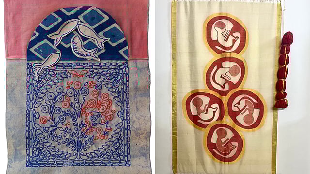 Alamu Kumaresan crafts embroidered portraits and abstraction using a variety of stitches and materials like beads, yarn, punch needle, tie-dye. Her textile 'paintings' celebrate women who inspire her — friends, mentors, and a self-portrait buoyant in water, transforming ordinary lives into affirmation of feminine strength. Aparajita Jain Mahajan engages in a delicate process of mark-making on handmade paper, where layered collages become a tactile topography of time, loss, and continuity, with her mother’s textiles reassembled into fragments of legacy and new narrative landscapes.