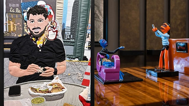 The artist uses multiple mediums to drive the message. As the son of renowned fashion designer Anamika Khanna, he grew up surrounded by embroidery and textiles. This influence is evident in his work, where his mastery of needle and thread is used to convey the fluid, messy nature of digital identities. His embroidered textile pieces use distorted faces to depict fragmented realities, underscoring the chaotic energy of our online lives. One textile piece features an embroidered replica of one of Viraj’s own Instagram posts. It shows him lounging at an upscale restaurant with a caption that reads, “$300 lunch…Should I upload so people know?” The subject’s face is deliberately warped and chaotic, embodying the dissonance between real experiences and their curated digital counterparts. It’s autobiographical, sure, but also uncomfortably relatable.