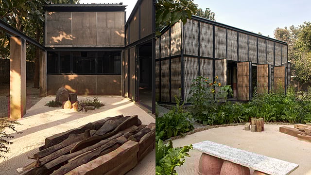 New Delhi-based Studio Array's design for the Farm8 artist residency in Arjanghar, New Delhi, draws from these indigenous architectural traditions to create an eco-conscious space for artists. Conceived nearly a decade ago by celebrated artists Ranbir and Rashmi Kaleka as a personal studio, the project began with the casting of foundations and columns before stalling for unforeseen reasons. By 2020, the site had evolved into something more significant: a working permaculture farm at the heart of New Delhi, and a space for the artist collective Farm8, whose members include the Kalekas, Bharti Kher, Subodh Gupta, Jagannath and Pranati Panda, Jogen Chowdhury, Shambavi Singh, Meera Menezes, Rajiv Bhargava, Anil Chandra, Manoj Arora, Eegje Schoo, and the late Sanjeev Sinha and Vivan Sundaram.