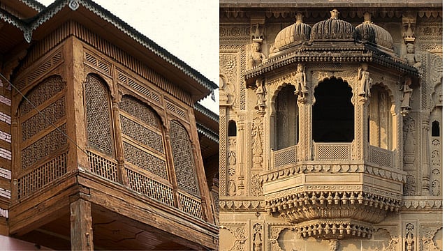 Seen in palaces, forts, and period films alike, the jharokha is synonymous with Rajasthani craftsmanship, beauty, and architectural drama. Projecting elegantly from sandstone facades, these overhanging windows are intricately carved with floral and geometric motifs. Beyond their decorative appeal, jharokhas were designed for ventilation and to allow residents, especially women, to observe street life discreetly. They were also a symbol of wealth and status, depending on the material and level of craftsmanship required for the carvings. Their layered screens and delicate brackets create shifting patterns of light and shadow.