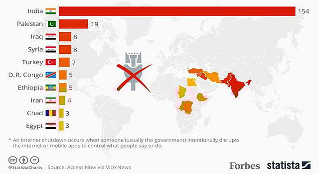 Between January 2016 and May 2018, 154 shutdowns were imposed, making India the country that tops the chart by a large margin when it comes to internet blackouts. Pakistan is second on the list followed by Iraq and Yemen (as of 2018), as per Statista data.