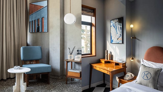 From its sculptural marble check-in counter to the melt-metal drips of the under-stair listening booth, The Kin Hotel in Mumbai is unmistakably design forward. Conceived by siblings Imrun Sethi and Guneet Singh in collaboratiom with architect Samir Raut of Atelier Nowhere and detail-driven ACKM Studio, the boutique hotel unfolds as a layered interplay of materials — terrazzo, Jaisalmer stone, marble, chevron wood — and a thoughtfully curated eccentricity.