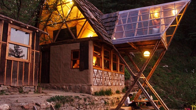Alongside it is the Dhajji House or Dhajji Cabin is an example of adaptive reuse and creative reconstruction. It is built by repurposing reclaimed wood and stone with the Dhajji Dewari method (a timber frame infilled with masonry) to yield a carbon-negative, earthquake-resilient cabin. The cabin’s interiors, fashioned with sculpted mud walls, inbuilt furniture and minimal glazing, feel like a living museum of craft. As a guest, one may stay in the main house or the more secluded Dhajji cabin, dine in a communal kitchen, wander into open studios or the archive room, and partake in conversations with makers on site.