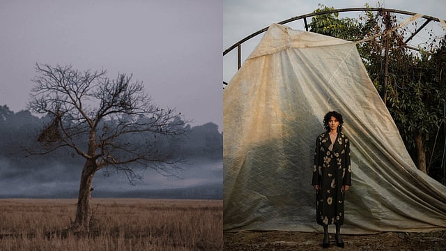 Designer Divyam Mehta’s latest collection, 'Gardener', uses the Japanese resist-dye technique of shibori as a generative principle for silhouette, texture and craft. The palette of olive, whiskey blue, coal and plum grounds the pieces in natural references, while the relaxed forms like lungi trousers, quilted jackets, draped dupattas, reflect Mehta’s interest in letting fabric and process dictate shape than the other way around.