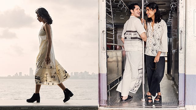 There’s also a sense of duality woven throughout the collection — grandeur and grit, motion and pause, memory and moment. It acknowledges the city’s contrasts without romanticising them. In a shirt, you may find the Taj Hotel and Dharavi side by side. In a dress, you may recognise a man weaving through traffic with eggs balanced delicately on a bicycle. The Jaali shirt is a personal favourite for me - the way the patterns mimc the railings of local trains, and feature familiar images that add depth of lived experiences - voices raised in banter, songs born from strangers, hands reaching out just in time to catch the train. Each piece from the collection is a reminder of how stories lurk in the unnoticed, the quiet, and the ordinary.