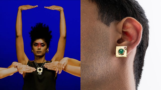 The jewellery itself is anchored by the motif of a hollow square throughout the collection and the campaign film. The square with a hole is a window through which parts of the wearer’s body are framed and perceived through. Some of the pieces are stark metal and gemless, while others are set with semi-precious stones from Jaipur. “It suggests a piece of the soul breaking free through that square,” Meghna noted. The rings, earrings, and pendants are designed not just as adornments but as expressions of departure, curiosity, and renewal.