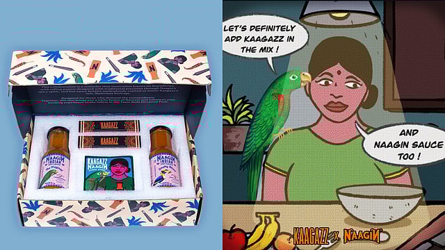 Together, their Tastebuds Elevation Pack becomes a pampering celebration of stoner culture. The box contains organic and biodegradable limited-edition rolling papers designed with traditional Indian motifs. For snackies later, you've got two full sauces Naagins's original flavour with Maharashtra’s Sankeshwari chilli and the Smoky Bhoot with Assam’s Bhut Jolokia chillies. The pack also has a curated set of extras, including exclusive stickers and a printed comic strip that brings together Kaagazz’s iconic Auntyji and Naagin’s signature parrot in a collectible crossover.