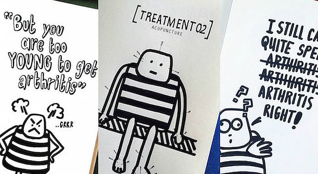 Inside Nahar’s sketchbook are bittersweet drawings that poignantly illustrate her life. Before she knew it, the artist ended up creating a character, Stripy, in her book who began living her struggles with her. Now her book is filled with thoughts that she wouldn’t have payed attention to if her doctor didn’t insist upon recording her life with RA.