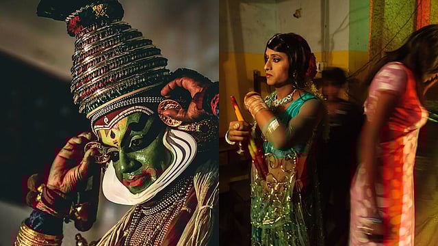 South Asian classical traditions have long explored gender through performance. In the classical theatre outlined by the Nātyaśāstra (a Sanskrita treatise on the performing arts compiled ca. 200 BCE–200 CE), men played female roles because women were not allowed onstage. This continues today in folk theatre forms like Kathakali in Kerala, where hyper-stylised representations of gender allowed male performers to become mythological heroines, goddesses, and demonesses through gesture, costume, and rasa, or emotion.