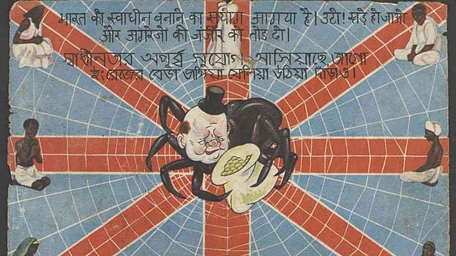 With bold images and fiery words written in Hindi and Bengali, they painted the British as monstrous overlords, sucking India dry, while positioning Japan as a liberator. Churchill, a favourite villain, was often drawn as a grotesque figure — sometimes feasting on a meal shaped like the Indian subcontinent, other times sitting atop a web like a predatory spider, trapping India in his imperial threads. One particularly chilling poster showed British officers carving a Union Jack onto the back of a shackled Indian, while another depicted Churchill personally cutting off the thumbs of Indian weavers, a haunting reference to the destruction of India’s textile industry by the British.