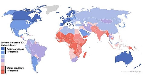 How It Works: The colour index on this map, based on a report by Save The Children, indicates that bluer countries are far better places to be a mother while the ones moving in the opposite direction are quite literally ‘in the red’ as far as being a mother is concerned.