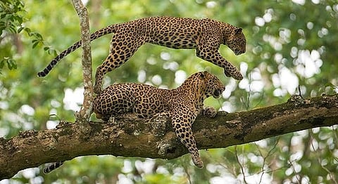 His favourite image from his oeuvre is the one you see below, of the male and female leopard in the midst of their mating game. “There are many favourites,” he says, “but the one that tops them all is the picture I captured of courting leopards. I was leading a photo tour in Kabini and my intuition led me to a place where I expected them to be, since I had seen them earlier in the day. The leopards were mating on a tree, and after some time the male lay down to rest on a branch 30 feet in the air. The female soon followed and didn’t have space to move ahead. Having been in the wild for so many years and observed their behaviour, my instincts told me that the female would jump over the male to get on to the other side of the branch. And that’s exactly what happened. It happened in a jiffy and I was ready, timing it perfectly and capturing the female mid-jump.”