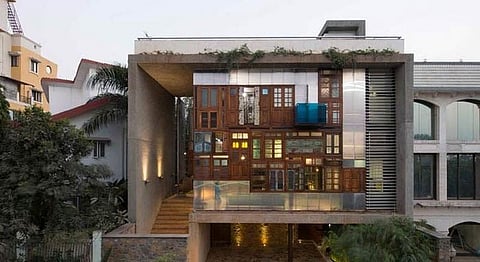 Patch work designs and a collage of recycled material come together in this uniquely constructed house sitting in Navi Mumbai’s Belapur on the top of a hill overlooking Mumbai city. Created by the architecture firm S+PS Architects, this private residence is designed to house four generations of the same family.