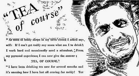 In this ad from The Indian Express, we hear of a first person’s account pertaining to his dilemma of Toddy shops closing down in his town. He asks, “If i can’t get Toddy any more, what am I to drink? I work hard and occasionally need a stimulant.” Well, the answer lays in front of the gentleman, clear as day - Tea. The second ad in the same series goes on to calling Toddy an enemy, deeming Tea to be your eternal friend. How could we not be friends with a depression erasing, energy giving nectar? Finally, it encourages us to give up any intoxicant use and take to tea instead.