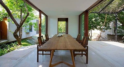 Robert explains that water bodies are beneficial to their vision, especially when building more rural homes, yet highlights the fact that the incorporation of a water body is not a ‘must’ in their work. He directs my attention to their Alibaug construction, House on a Stream. “The stream bifurcates the house, into two parts, (thus) the stream becomes the centre point of the house. Usually, a house will look into or over the landscape, but here that focal point of nature is instead a part of the house.”