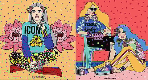 Her Instagram account @srillustrator is the converging point of art, high-end fashion, and meme-culture. With women adorned in some of the most vibrant floral prints, proudly owning their resting bitch faces—Srishti’s memes are quirky, flamboyant, and most definitely an accurate reflection of the millennial reality we see all around us. “I didn’t deliberately choose a style which is bold and colourful, the style chose me. However, I have always been a fan of colours. There is something so happy and positive about the interplay of bright colours and patterns,” she tells us.