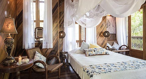 The spacious tree house has two levels. The lower level is comprised of the lounge that also acts as the living and dining space and houses the bathroom. The only bedroom is located on the upper level that is surrounded by tamarind and acacia trees on all around and adorned with blue pottery knick-knacks and antique wooden furniture that add to the property’s rustic old-world Goan charm.