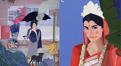 DhakaYeah uses quirky illustrations to bring out the beautiful and the bizarre of South Asia and its culture. The illustrations are usually mild and subtle, filled with soothing hues. Yet, paradoxically enough, the imagery is extraordinarily striking and definitely of the kind that stays with the viewer. In conflating Western modes of desires with desi belongings, DhakaYeah’s sense of nostalgia is ever-evolving and starkly relatable. A beautiful evocation of post-colonial South Asia, DhakaYeah ascribes to as much of Shakespeare’s masala as they do to Tagore’s heart in their art. Rooh Afza is served with the full moon on a silver platter, and the monsoon tea is revived as a woman enjoying her tea alone with a dog peeking from below. Coca Cola (typed in Bangla) is illustrated as the favourite companion for when you find yourself staring at the big, black telephone, waiting for your lover’s call.