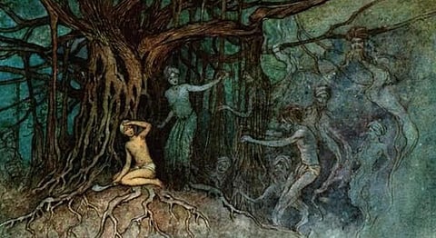 In a Bengali proverb from Comilla (Bangladesh), roughly translated as “ghosts inhabit a broken-down house,” the house signified the human body crumbling under various incurable ailments, which attracted ghosts to make the ailing human one of their own. Local legends from Rangpur (Bangladesh) dating back to the 19th century described the habitats of different types of ghosts in various kinds of trees, namely Palmyra, Tamarind, and Madar. The allocation of habitats in the spectral world mirrored anthropocentric normativities associated with gender roles. For example, the male Brahmin bachelor ghost, namely the Brahmadaitya, usually inhabited tall evergreen trees like Peepul maintaining his social superiority over others even after death. Female ghosts inhabited smaller shorter bushes and shrubs. The Brahmadaitya’s habitat in comparison with the female ghosts’ habitats illustrated not only his primacy on the social ladder, but also the gender normativities permeating into the spectral world from the human world. Moreover, while ordinary ghosts, both male and female, were described as dark-skinned, the Brahmin male ghost was portrayed as fair-skinned, tall, exhibiting saint-like feet, and wearing sandalwood sandals.