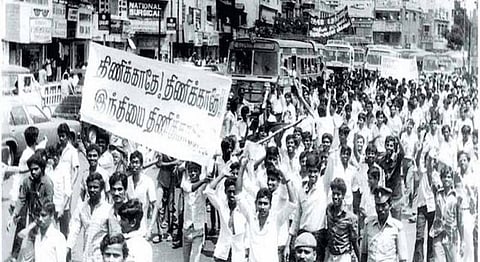 The first protest can be dated back to 1937 when a Government Order issued the compulsory learning of Hindi in all government schools. After Periyar EV Ramasamy’s Self Respect Movement and the Justice Party protested for three years (resulting in two fatalities), the Order was withdrawn in 1940.