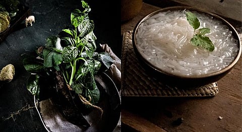 Some of the many dishes documented by Abhijit include the jharra, and mandiya. Jharra is made from an ingredient called paluo. It’s basically tarrow root blended, mixed, made into porridge, and then shaped into noodles while it is still piping hot Once it gets its shape, a little sugar syrup is poured into it. In earlier days, some people used jaggery in this mixture, while others used curd and black pepper. It’s basically a sweet soup and is used to cool down the stomach in dry and tropical regions.