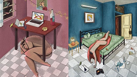 The men in his illustrations tell us that it's okay to acknowledge your loneliness and despair with some hot chocolate in the blanket and a little TLC instead of driving really fast in the rain or getting sloshed which has sadly become the prerogative of men struggling with mental health in the backdrop of false notions of masculinity.