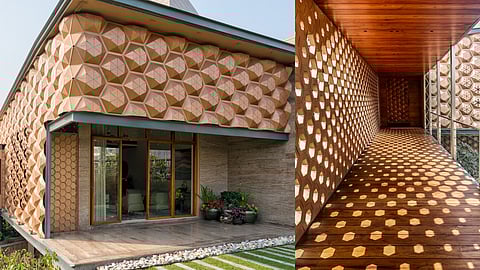Helmed by principal architects Monarch Champaneri, Nilesh Gajera and Niralee Champaneri — three college friends who worked in different countries across Asia, Europe and North America — the portfolio of OpenIdeas is awash in crosscurrents of cultural legacy and technological innovation. Fiercely loyal to the requirements of its clients, the studio excels in balancing its own aspirations for avant-garde design and moulding the constructed space to the personality of those who would be inhabiting it in real life. The owner of the Hive house, Kamalbhai Mistry, was looking for an amenable abode with structural efficiency and sustainability at the fulcrum of his vision. Given his proficiency in mechanical engineering for the diamond industry, the client was well researched upon how to go about 'manufacturing' a smart structure that would be endowed with uniquely striking elements.