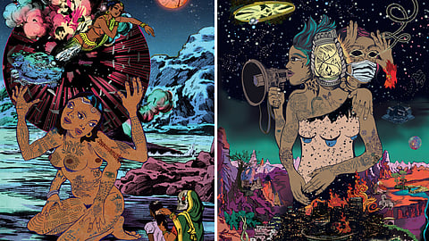 Her work is a convergence of surrealism and futurism, with female characters leading the narrative. Some of her projects include 'Multiverse Dreaming' — a suite of twelve digital prints informed, in part, by an increased sense of solitude over the course of a pandemic, the power of collective dreams and collective consciousness, 'Architects of Future' — integrating the visual languages of 60s and 70s science fiction and mid century Japanese comics in a retro-futurist universe where bodies, like time, are fluid, and 'She the Question' — featuring women as protagonists in their own right, actively articulating their pasts and shaping their futures, offering alternative articulations of conflict, desire, and power, through abject imagery and disjunctive narratives.