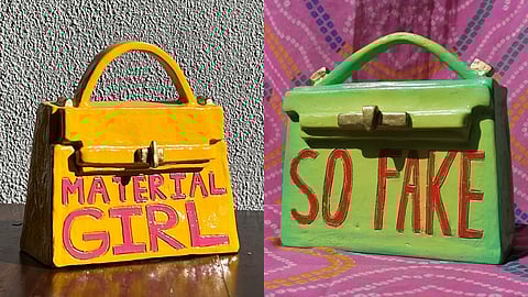 The 'false ceramic' handbags are up for display in an exhibition in Johannesburg, South Africa till March 11. The description for the exhibition reads, "A loud and deliberate gesture. A conversation between India the prophecy and a younger version of myself – a double diaspora desi, in the throes of belonging and not, all at once. An anthem to flamboyance, camp, boyish effeminacy and spectacle. Spanning a series of bright and chalky sculpted accessories, Desi Casual Glamour is a mosaic of Indian cultural references, songs and affections.