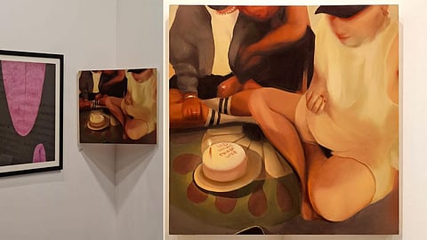 “Three Taurses” is a heartfelt painting that commemorates the joint birthday celebration of myself and two queer friends I met in Bangalore. Our birthdays fall within the same week, and for the past three years, we have joyously celebrated together. These intimate gatherings are vital to my existence, helping me navigate the structures of heteronormativity and the conscious and subconscious negotiations we perform in everyday life.