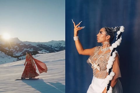 When I stumbled upon a video of BombayMami snowboarding down the Swiss Alps in a bright red lehenga, her dupatta billowing behind her in the wind, I realised I had discovered something truly special. The Indo-Swiss artist rapped along to her latest single, ‘Fire in Delhi,’ while soaring down the slopes, her sultry voice backed by an Indian classical-inspired beat and a sitar.
