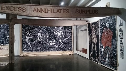 As a practitioner of visual propaganda, the artist's expansive repertoire transcends traditional boundaries, encompassing drawing, painting, photography, graphic/poetry novels, posters, banners, graffiti, raw video documentation, diaries, journalistic documentation, festoons, articles, magazines, installations, and performances. In a departure from conventional framing, the artist's work evolves into a discursive platform that invites viewer participation, transforming the work of art into a shared space for diverse experiences. This interdisciplinary approach is informed by both theoretical insights and ground-level engagement, allowing the artist to traverse multiple terrains simultaneously. Thus, the artist's visual practice extends beyond image-making and incorporates a lot more. It is important note how the focus of Anupam's practice goes beyond the creator and onto the masses.