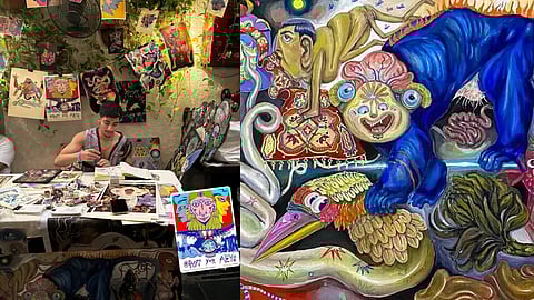 “I think my work is very semi-conscious,” Sahil says. “It’s very inspired by nature and energies that are beyond. I’m chasing that super-consciousness through my work.” For Sahil, art is not about what is immediately visible; it’s about the spaces between. His pieces are complex, maximalist compositions that explode with color and texture, where the surreal bleeds into the organic, and reality is only a vague suggestion. As someone who describes his art as “instinctive”, he often works without a clear plan. His process is fluid, driven by intuition. “It’s like a stream of consciousness,” he explains, “where I just let my hand guide my mind.” This approach feels like an effort to step out of his own way, to allow something deeper — perhaps even spiritual — to emerge.
