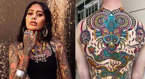 “I am, at the core, a colourful creative person both in my work and as a person,” says Swasthik Iyengar, an Indian-origin tattoo artist living in Australia. Growing up at the cusp of two distinct cultures, hers has been a journey of self-discovery, finding herself in tattooing and being constantly inspired by her grandmother who was a tattoo artist herself. Borrowing from indigenous tattoo traditions, her work is a celebration of Indian art forms and storytelling and of weaving narratives through motifs on the blank canvas of the skin.