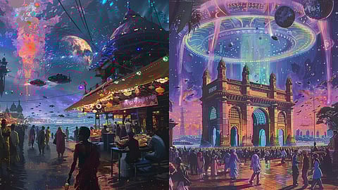AI art meets speculative fiction through Tejas Nair’s fantastical series, India’s first Interstellar Cultural Festival. Imagine Mumbai to be a melting pot of culture but here’s the catch — you don’t get to experience only earthly cultures but cultures from around the cosmos. The famous Mumbai skyline is dotted with intergalactic portals to Planet Earth - the historical monuments have transformed into teleportation hubs.