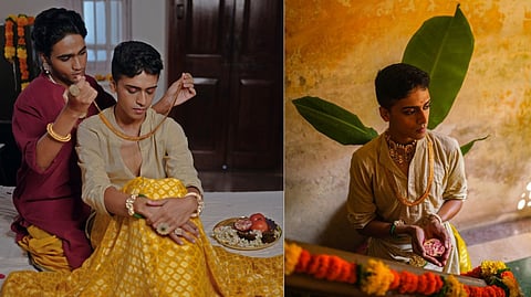 The captivating imagery showcases traditional marital practices in a new light by utilising backdrops and visuals that remain beyond reach for a love that dares to oppose heteronormativity. Hence, the series further emphasising the idea that love and companionship flow beyond physical bodies and can blossom between individuals who embody complementary energies. The prominence of auspicious flowers, alta and a tender relationship draws us in to enquire about traditions through the lens of queerness. All of this is emphasized beautifully by juxtaposing scenes of a marriage with a budding romance between individuals embracing their masculine and feminine energies.