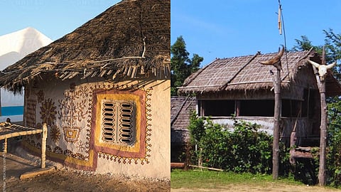 In the desert areas of Rajasthan and Kutch, the 'Bhonga' features a circular shape, thick mud walls, thatched roofs, and local materials, ensuring a cooler interior amidst searing heat. In Kerala and parts of South India, the 'Naalukettu' incorporates an internal courtyard, large windows, pitched roofs, and terracotta roof tiles to cope with the tropical climate. The 'Zawlbuk' House in Mizoram represents a simple yet culturally significant structure made of thick bamboo mats, split bamboo poles for partitions, and a thatched roof, preserving tribal traditions in the Northeast with hay and straw as integral materials.