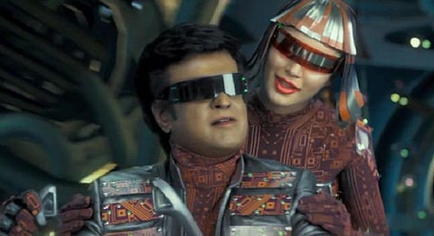 The new Tamil superhit 2.0 – sequel to Robot – just hit theatres today. As a teaser, Dharma Productions released a visually striking Hindi version of the film’s most famous music video, Tu Hi Re, featuring none other than Rajnikanth and Amy Jackson as two robots drifting in a strange, very high-production value futuristic… warehouse? With no shortage of brightly coloured costumes, shiny purposeless orbs of all sizes, neon eyelids and even an endless flow of bubbles (yes, bubbles), the two actors glide in and out of sets full of steam-blowing disco vents on weirdly-shaped motorbikes.