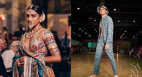 Featuring designers across the South Asian diaspora, the shows were categorized by streetwear, sustainability, menswear, traditional, bridal, and Indo-western styles. Featuring two headliners Nomi Ansari and Mayyur Girotra, along with 13 other upcoming design houses like Recover Season and Pali, SANYFW launched on September 8 and will run through the week until September 14. Mayyur Girotra opened the show with his couture Indian wear –– Zamani, featuring monochrome lehengas and saris with intricate, classic embroidery.